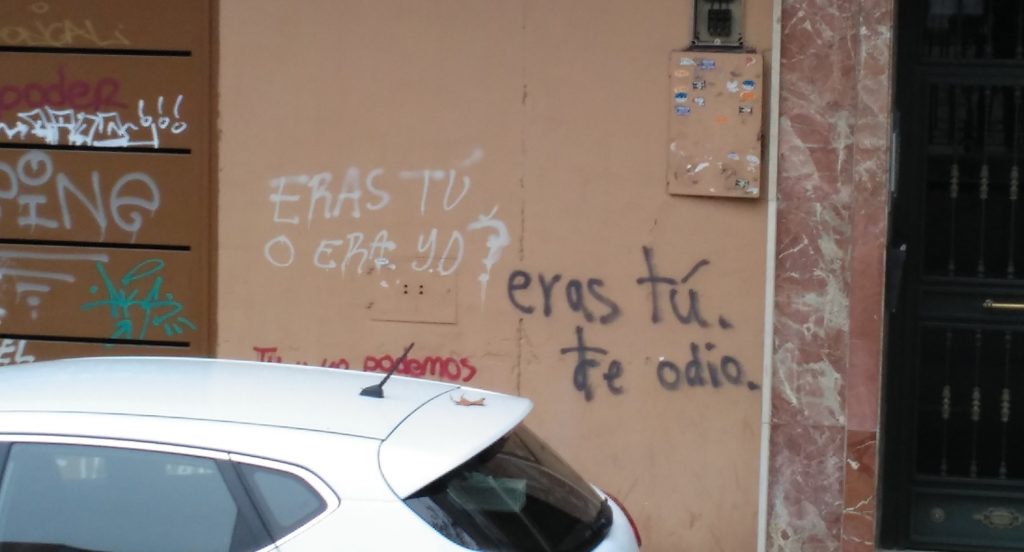 Si se difumina el rostro de los culpables, si esto poco menos que nos-ha-tocado, es fácil que nuestro dedo se vuelva contra nosotros mismos, el arma contra nuestra sien. Es lógico, el autodesprecio es otro proyecto disciplinador más del capital como lo es agitar y monetizar nuestro miedo, ya sea a un apagón, al desempleo o a que te entren en casa. Hundidos, igual que endeudados, somos más baratos. Hace años vi en Granada una pintada. “¿Eras tú o era yo?”, preguntaba alguien. Quizá al viento, quién sabe. Al lado, una respuesta: “Eras tú, te odio”. Necesitaremos esa determinación y pasión. La autoestima colectiva será, lo está siendo ya, clave a la hora de sujetarnos entre todos para no caer al abismo.
