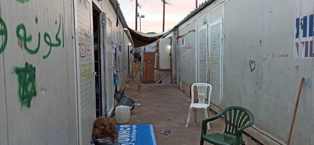 El campamento se oraniza alrededor de una nave industrial dentro de la cual se encuentra el centro de atención primaria de “Salvamento Marítimo Humanitario, la única asociación que queda ofreciendo asistencia sanitaria ahora mismo. El espacio lo comparten con distintas oficinas de la Administración griega y cada una de sus puertas está flanqueada por policía que controla mediante registros la entrada de las personas refugiadas, incluidos tres hermanos afganos que necesitan atención sanitaria y que rondan entre los 12 y los 4 años. La imagen de los tres, con sus brazos y piernas extendidas mientras un policía recorre sus pequeños cuerpos con un detector de metal, es descorazonadora.
