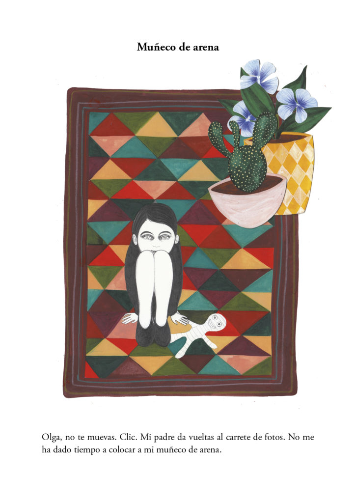 Para emprender este viaje, Sara Morante se ha calzado los zapatos de la infancia y ha recreado el universo infantil de Olga intentando abarcar sus múltiples dimensiones: la de lo que imagina, la de lo que piensa, la de lo que teme, la de lo que sueña y, finalmente, la de lo que realmente le pasa. Para ello, la autora se ha servido de la libertad narrativa que le proporcionan sus poderosas armas: los lápices de colores, el gouache, los collages. Porque Morante es una de las ilustradoras más prolíficas e importantes del panorama actual con una veintena de libros ilustrados, entre los que se encuentran obras tan importantes como Cumbres borrascosas, de Charlotte Brontë (Alma), Me moriré en París, de César Vallejo (Nórdica), Una habitación propia, de Virginia Wolf (Seix Barral) y Ariel, de Sylvia Plath (Nórdica). Además, en 2015, publicó su primera historia como autora, La vida de las paredes (Lumen), en la que se desarrollan las vidas cruzadas de los habitantes de un edificio antiguo de Madrid y que recomiendo con fruición.