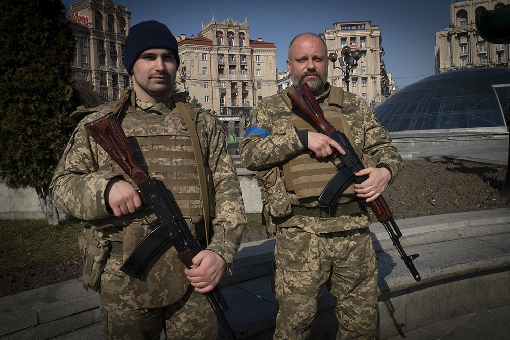 KIEV (UCRANIA)// Anton Parambul y Dymitro Cooper Kupriyenko llegan a la cita uniformados y pertrechados con sus armas mientras el sonido de los bombardeos y los disparos retumban en los edificios que nos rodean. Pareciera que la batalla estuviera teniendo lugar a unos pocos cientos de metros cuando, en realidad, son al menos 13 kilómetros los que nos separan de la línea del frente de Kiev en la que ambos combaten. Son destacados miembros de la unidad anarquista Black Flag, aunque rechacen aclarar su rango. Acuden al lugar de encuentro acompañados por su comandante, una mujer cuya identidad insisten en preservar.