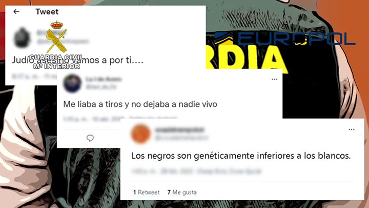 Más de 240 publicaciones en diferentes perfiles de redes sociales cuyo contenido podría ser constitutivo de delitos de odio, cuatro detenciones, un investigado y dos registros domiciliarios. Este fue el resultado de una actuación practicada por la Guardia Civil el pasado 7 de abril, coordinada por la Oficina Europea de Policía, Europol, a través del Centro Europeo de lucha contra el Terrorismo. La operación se llevó a cabo, además de en España, en diez países más de la UE: Francia, Austria, Bulgaria, Alemania, Lituania, Luxemburgo, Noruega, Portugal, Rumanía e Italia.