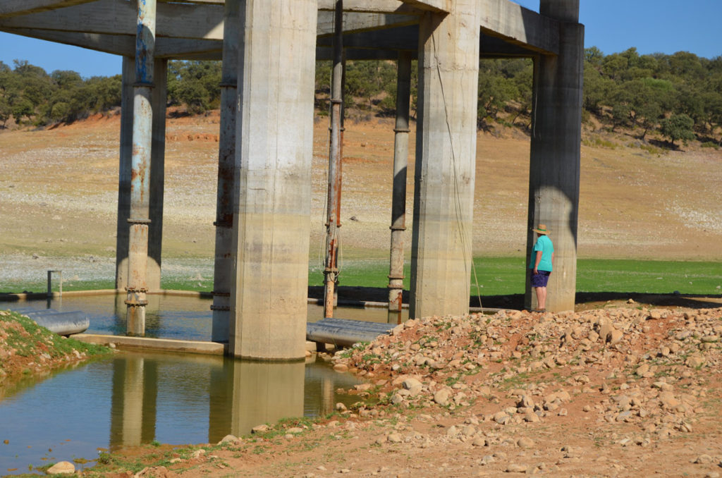 José Antonio detiene su coche en la puerta del recinto de la estación de bombeo de agua. Allí, un antiguo cartel y una fotografía muestran la ubicación de la planta de captación, inmersa dentro del pantano y de la que salen unos tubos gigantescos que se adentran en la tierra. En la actualidad, la situación es bien diferente, ya que la estación se encuentra fuera de las aguas tras el descenso de las reservas. Así, una de las colas del embalse que llegaba hasta la población, ahora es un enorme desierto por el que caminan unas ovejas que buscan algunos pequeños brotes enterrados.