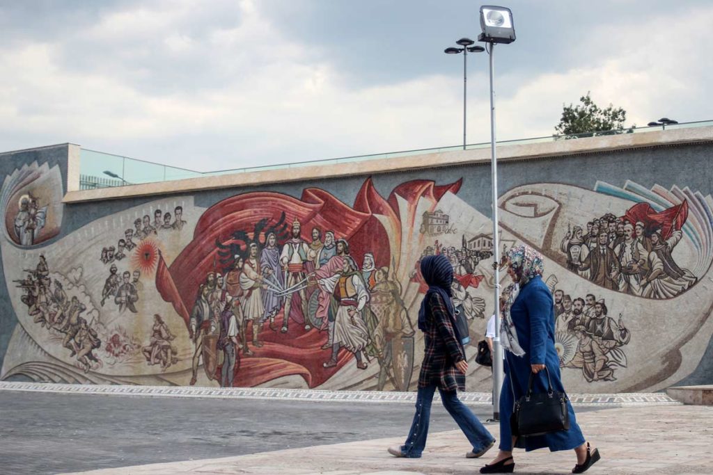 Dos mujeres pasean por delante del mural en honor a los líderes históricos albaneses, en la conocida como plaza de Skanderbeg, en Skopje. MIGUEL FERNÁNDEZ