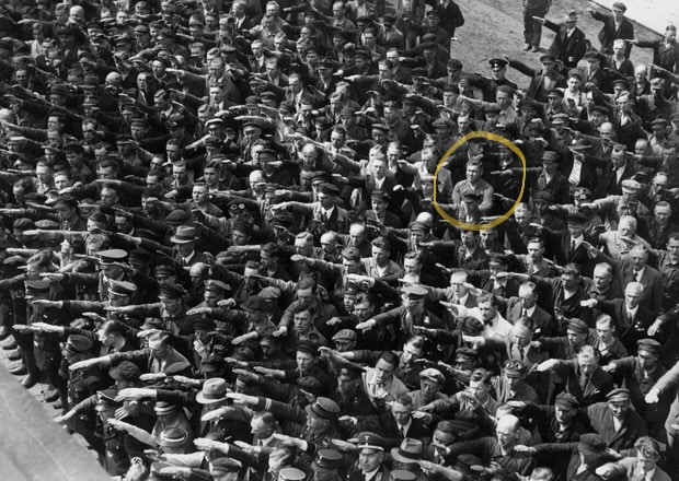 Lo pienso en Berlín, en el espacio pedagógico llamado Topografías del terror, ante una foto en la que se ve a centenares de personas con el brazo alzado y, en medio de ellas, un hombre con los brazos cruzados y gesto de enfado. La fotografía es famosa, quizá por lo poco habitual en un mundo en el que lo frecuente es la sumisión. No es fácil ser ese hombre que se niega a levantar el brazo; sabe que muchos de quienes lo rodean, en realidad, no son nazis, pero tienen miedo, un miedo que podría llevarlos a denunciarlo. Y es posible que también él lo tenga. Pero sabe que hay un nivel de indignidad a partir del cual es imposible mirarse al espejo. Todos claudicamos en algo, todos cedemos a veces por temor; pero también queremos creer que hay líneas que no cruzaríamos nunca, esas líneas que nos pondrían irremediablemente del lado de lo inaceptable.