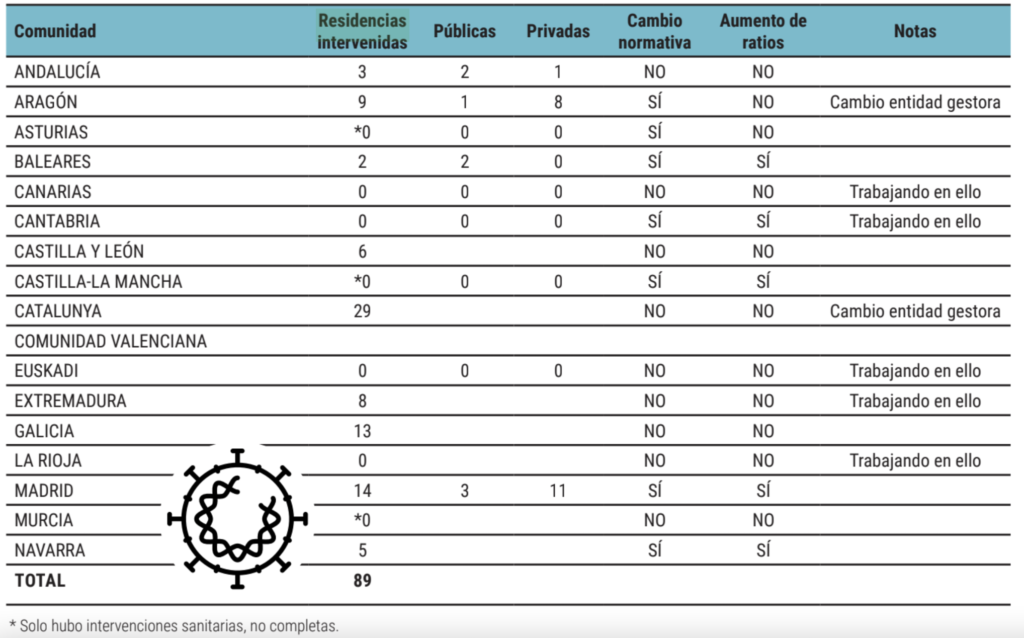 Los tres centros intervenidos en Andalucía (dos públicos y uno privado) han vuelto a su gestión habitual, no ha habido sanción ni cambio normativo. En esta comunidad, 3.162 mayores han perdido la vida en las residencias. Y en Murcia, donde fueron intervenidas sanitariamente seis residencias y han fallecido 413 personas, señalan que actualmente se están tramitando dos procedimientos sancionadores respecto al funcionamiento de una de ellas, “pero no por motivos relacionados directamente con un brote de coronavirus”.