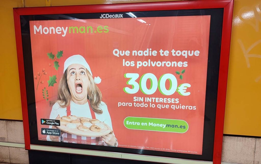Bajando por las escaleras mecánicas del metro –si es que no están estropeadas–, te encuentras de frente, como esperándote, varios anuncios de una reconocida firma de microcréditos. En ellos, puedes ver a una señora de mediana edad, de unos cincuenta años, que posa con una cara extraña, como de susto, sosteniendo una bandeja de dulces navideños. La foto, que se encuentra en un fondo rojo muy navideño, viene acompañada de un mensaje que reza: «Que nadie te toque los polvorones. 300€ sin intereses para todo lo que quieras. Entra en MoneyMan». Más abajo, en letras minúsculas y cortado por el propio marco de la publicidad, se puede leer con mucho esfuerzo: «Promoción válida máximo 300 euros hasta 30 días. Devolución en día de vencimiento, préstamos sucesivos: Ejemplo TAE 300 euros a 30 días. Coste préstamo 99 euros». Más abajo, donde aparece el porcentaje de TAE, TIN y los costes de demora, es imposible distinguir nada, pues ESE DIA? el anuncio se encuentra casualmente cortado.