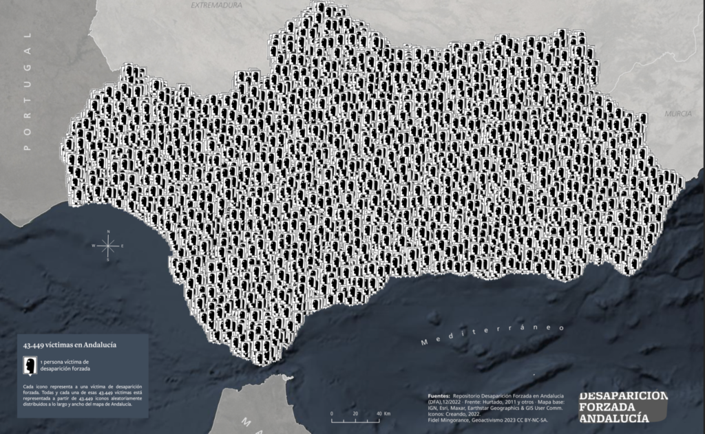 En esa carrera de fondo que emprendieron hace años las familias de víctimas del franquismo, el pasado viernes se presentó en Sevilla una Cartografía de la Desaparición Forzada en Andalucía. El título en sí mismo es una declaración de intenciones: los mapas recogidos en este libro –también desarrollados en una página web– no sólo recopilan en detalle 798 fosas comunes en la comunidad autónoma (89 más que en el mapa oficial de la Junta de Andalucía) sino que abordan “enfoques inéditos” en el análisis de este crimen de lesa humanidad: desde el género al colonialismo: “Esto no es un mapa de fosas, es un mapa de personas desaparecidas forzadas”, sintetizó de manera gráfica la persona encargada del repositorio, Fidel Mingorance, autor, además, de la Cartografía de la Desaparición Forzada en Colombia.