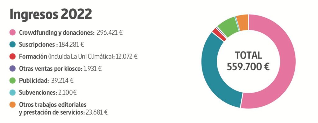 Los ingresos de 2022 llegaron a los 559.700 euros, los más altos de la historia de la cooperativa. Casi el 51% de los mismos corresponden al importe obtenido en el crowdfunding. Las suscripciones (184.281 euros) fueron la segunda mayor partida de nuestros ingresos, y supusieron casi un 33%. Muy alejada se encuentra la publicidad, que con un total de casi 39.214 euros en todo 2022 representó un 7% de los ingresos de la cooperativa (la publicidad institucional, un 3,88%).*