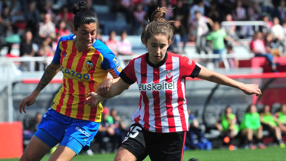 Marta Carro y Clara Pinedo disputan un balón en un partido entre el Valencia y el Athletic de Bilbao de la pasada temporada. Liga F.