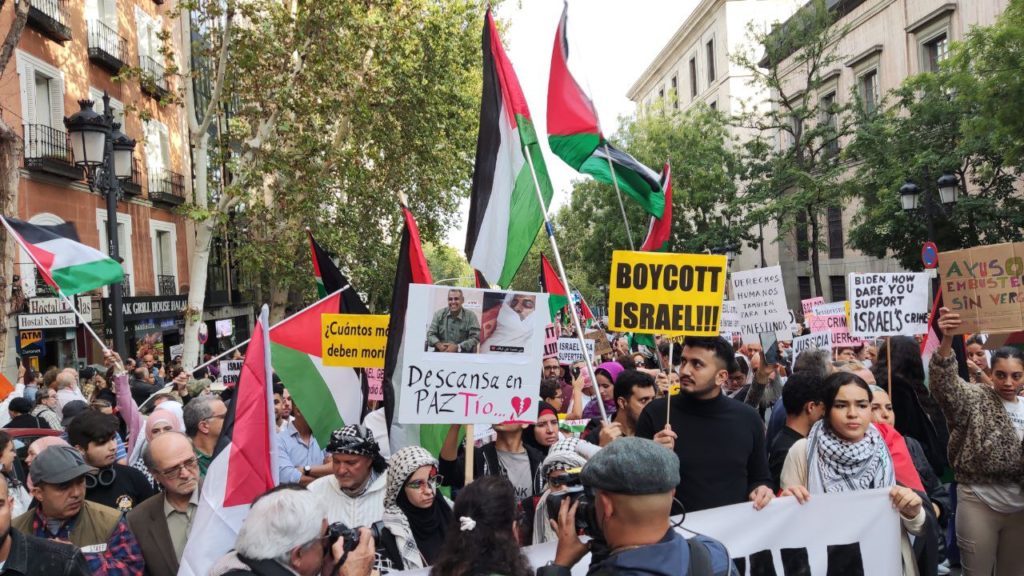 9.000 personas, según la Policía, se han concentrado en Madrid en apoyo a Palestina tras los ataques por parte del Estado de Israel. La marcha ha recorrido la capital española desde Atocha hasta la Puerta del Sol con el objetivo de denunciar la masacre que el gobierno de Benjamin Netanyahu está llevando a cabo en la Franja de Gaza y que ya se ha cobrado la vida de más de 2.000 personas.