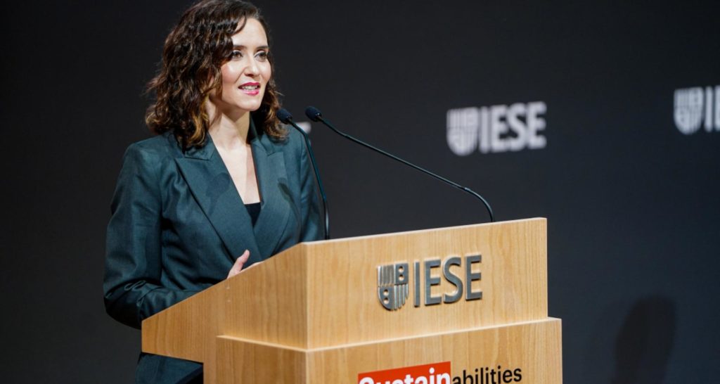 En 2021, Ayuso, ya como presidenta de la Comunidad de Madrid, clausuró la Global Alumni Reunion, el encuentro de antiguos alumnos de la escuela de negocio.
