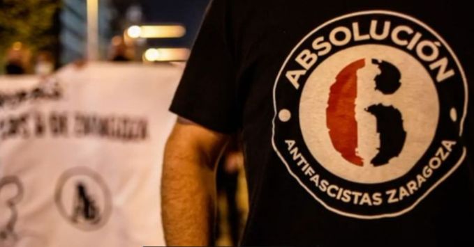Este lunes, 12 de febrero, la Plataforma por la Absolución 6 de Zaragoza ha convocado dos concentraciones (en la plaza de las Cortes de Madrid a las 18.00 horas, y a las 20.00 horas en la plaza de España de Zaragoza), con el lema: “Manifestarse ante la extrema derecha no es un delito”.