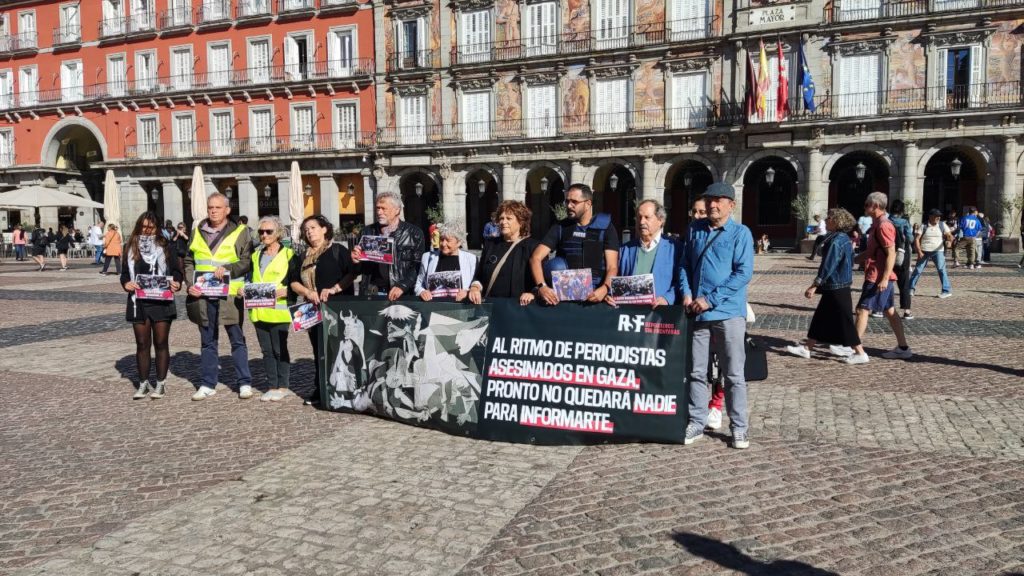 «Más de 130 periodistas y profesionales de los medios han sido asesinados por el Ejército de Israel desde el 7 de octubre de 2023». Así comienza el comunicado leído por la vicepresidenta de Reporteros Sin Fronteras (RSF) en España, Edith Rodríguez, en la Plaza Mayor de Madrid, este jueves. Acompañada de una decena de periodistas, la portavoz de la organización ha denunciado que el objetivo de Israel es «que no haya testigos» que puedan denunciar la masacre cometida por su ejército.