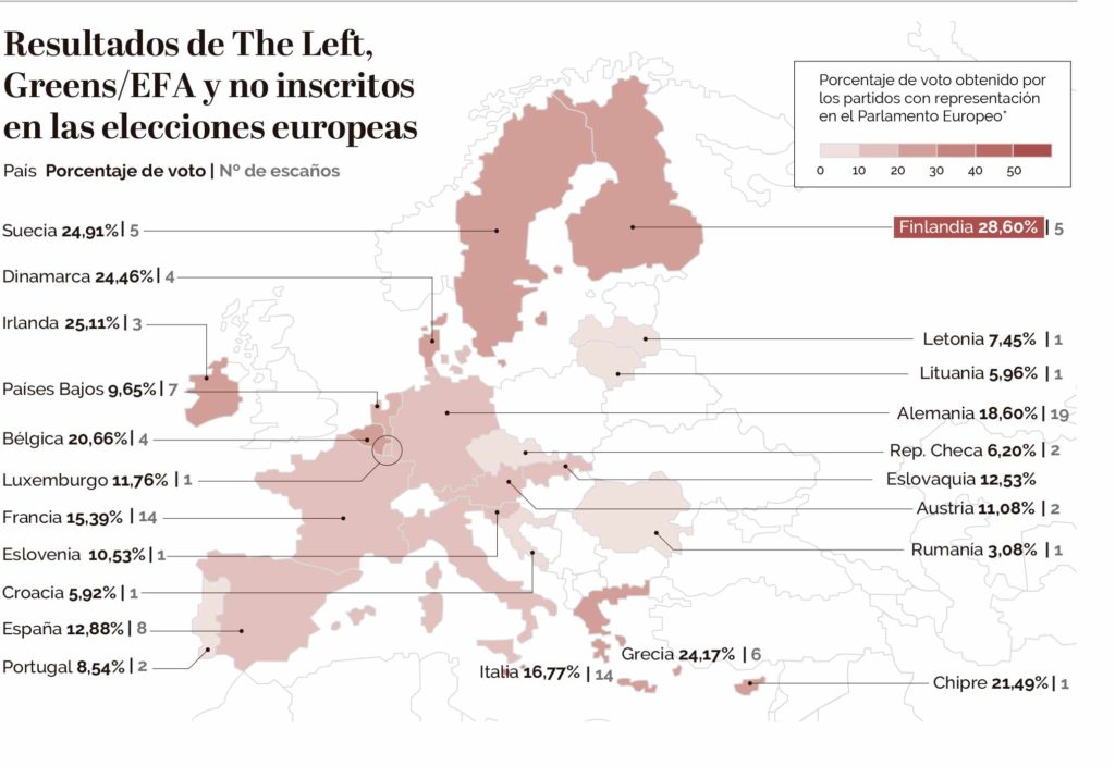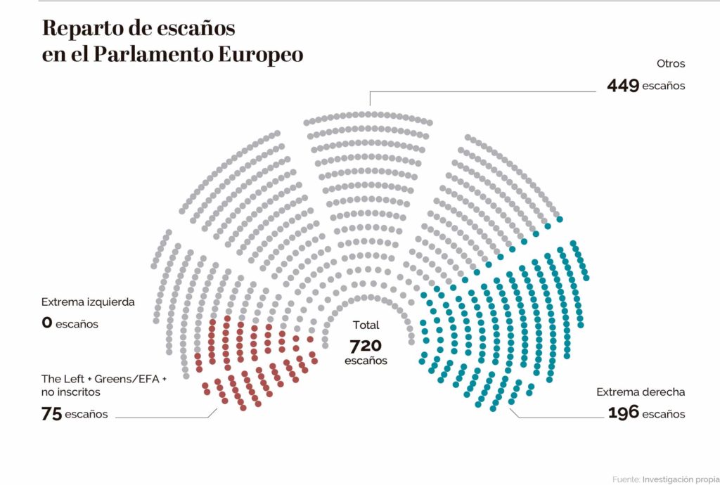 Sin ese lavado de imagen sería difícil entender la estrategia que usó la presidenta de la Comisión Europea, Ursula von der Leyen, el pasado mes de mayo, al abrirse a pactar con la líder neofascista Giorgia Meloni, lo que habría roto el cordón sanitario europeo frente a la extrema derecha. Finalmente, la formación de la primera ministra italiana, Fratelli d’Italia, no votó a favor de la candidatura de Von der Leyen por «coherencia», aunque se mostró dispuesta a colaborar con ella para «sacar adelante muchas cuestiones, como el asunto de la inmigración». Así pues, a Von der Leyen no le hizo falta contar con los ultras para mantenerse como presidenta de la Comisión, pero de haberlo necesitado habría tenido dónde elegir: en la Eurocámara hay 196 diputados de extrema derecha. Un número que contrasta con el de los diputados de extrema izquierda: cero. The Left, Los Verdes y los no inscritos, es decir, la familia política que se sitúa a la izquierda de los socialdemócratas, suman 75. Y no se les puede considerar extrema izquierda en sentido estricto ya que se limitan a exigir una fiscalidad más severa para las grandes fortunas. Nadie, en ninguna cámara, sea regional, estatal o supranacional, está pidiendo la confiscación de los bienes de la burguesía.