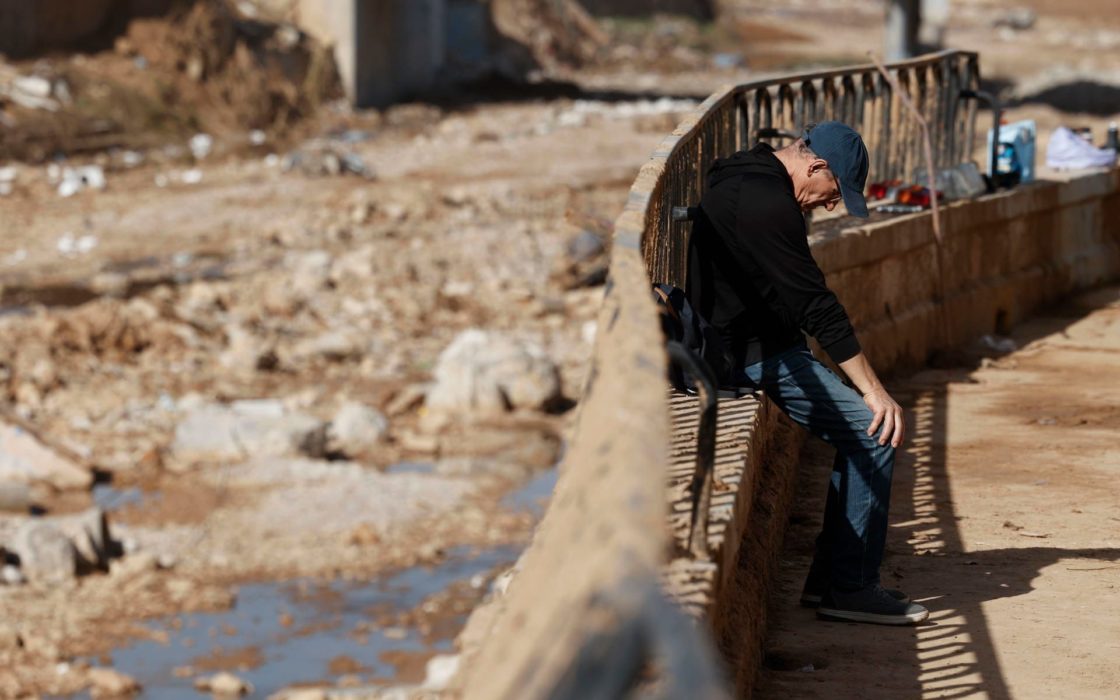 Un hombre toma un descanso junto al barranco del Poyo a su paso por Paiporta. BIEL ALIÑO / EFE