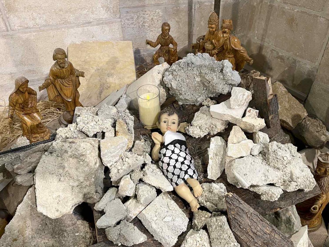 En ese particular pesebre, el Niño Jesús, arropado con una kufiya—el pañuelo tradicional palestino— reposa sobre una pila de escombros, como símbolo del incesante ataque de Israel contra la población de Gaza. En vísperas de la navidad de 2023, el pastor de esa iglesia, el reverendo Isaac Munther, pronunció un sermón llamado “Cristo entre los escombros”, que se viralizó en internet. A casi 450 días del inicio de los bombardeos israelíes contra la Franja de Gaza, en los que han sido asesinados más de 45.000 palestinos.