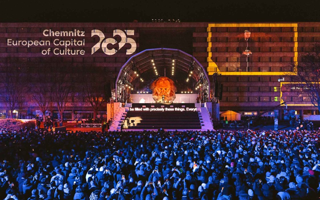 El emblema de Chemnitz es una gran estatua de Karl Marx sobre la que se construyó el escenario que acogió los conciertos inaugurales. Allí, el presidente de la República Alemana, Frank-Walter Steinmeier, dio la bienvenida a la capitalidad.