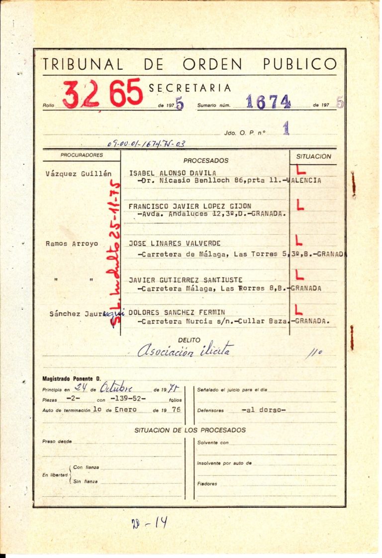 Permaneció en comisaría varios días más. En total, sumaron ocho. Finalmente, la Brigada Político-Social la sometió a interminables interrogatorios, en los que siguió al pie de la letra las instrucciones del cuadernillo Los comunistas ante la policía y los tribunales y se dedicó a negar todas las acusaciones. “Estaba aterrorizada, porque se sabía que estaban torturando salvajemente, pero a mí no me tocaron ni un pelo porque estaba embarazada. Mi hijo siempre dice que me salvó de la tortura antes de nacer”, cuenta. El 18 de octubre de 1975, el juez decretó prisión provisional para Isabel Alonso Dávila y su compañera Dolores Sánchez Fermín y, dos días más tarde, se le notificó la apertura de un proceso en el TOP. Ingresó en la cárcel de mujeres de Granada. “Había mujeres por adulterio, recuerdo a dos; mujeres por aborto, recuerdo a dos; y luego estábamos también cuatro políticas”, enumera.