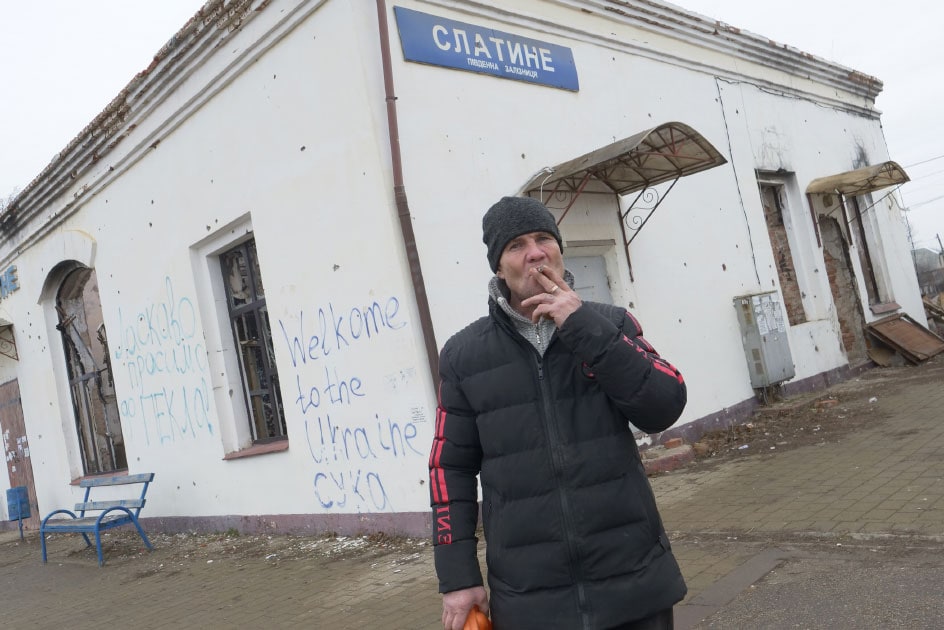 Llegando ya al diminuto centro de Slatyne, la guerra se presenta de forma categórica. Solo hay dos o tres negocios abiertos, con sacos terreros o listones de madera en las ventanas, y una clientela escasa y evasiva, que entra y sale rápido, si acaso acude a la casa municipal para recibir la ayuda humanitaria que se reparte rápidamente en una o dos cajas que la población (anciana en su práctica totalidad) carga en carritos de la compra o bicicletas, pues aquí los coches son un lujo del que casi nadie ha disfrutado nunca, con o sin guerra.