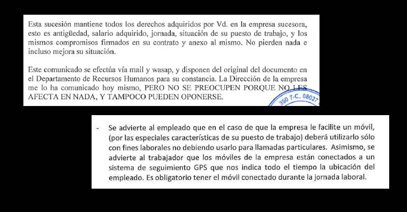 Los cambios de empleador son frecuentes, repentinos y sin explicación. En una ocasión, los trabajadores recibieron una circular donde se les informaba de su traspaso a otra sociedad del mismo administrador, con un mensaje inequívoco: «NO SE PREOCUPEN PORQUE NO LES AFECTA EN NADA, Y TAMPOCO PUEDEN OPONERSE».