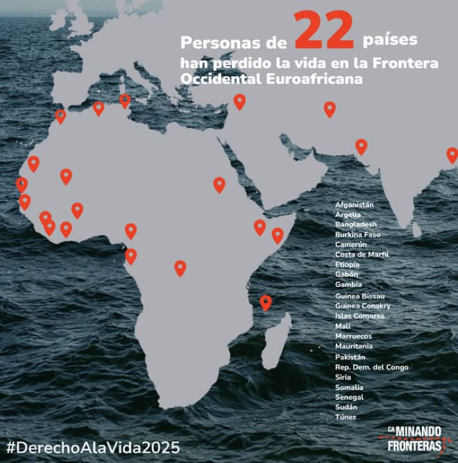 Desde enero hasta finales de mayo de 2025, han fallecido 1.865 personas intentando llegar a las costas españolas, de las cuales 112 eran mujeres y 342 eran niños y niñas menores de edad. En este periodo, 38 embarcaciones han desaparecido con todas las personas a bordo.