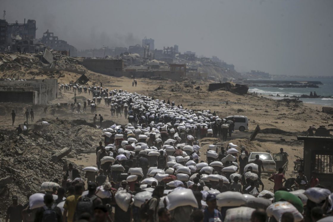 Palestinos desplazados internamente llevan bolsas de harina cerca de un punto de distribución de alimentos en Zikim, en la franja de Gaza norte, el 27 de julio de 2025. EFE/EPA/MOHAMMED SABER