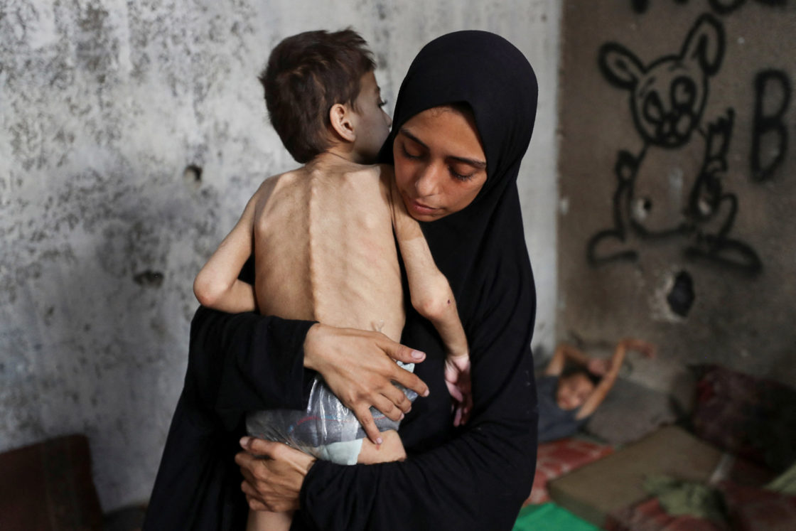 Samah Matar sostiene a su desnutrido hijo Youssef, que sufre de parálisis cerebral, en la escuela en la que se refugian en medio de la hambruna provocada por Israel, en la ciudad de Gaza, el 24 de julio de 2025. MAHMOUD ISSA / REUTERS