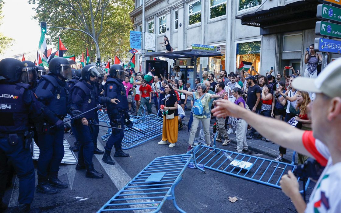 Desde la hora del vermú, las calles del centro de Madrid son rojas, verdes, negras, blancas. Una bandera como peineta, una kufiya sobre los hombros (suelta, que hace mucho calor). Las convocatorias llaman a estar a partir de las cuatro en las zonas de más visibilidad de la llegada de la Vuelta. Desde horas antes, la zona de la estación de Atocha está llena de manifestantes, y a su alrededor se despliega un operativo policial que los telediarios de mediodía dicen que no tiene precedentes en un evento de este tipo. Unas calles más allá, pasando junto al Congreso, la Carrera de San Jerónimo está vallada, pero más despejada de todo -manifestantes y policías-: ¿será un plan B por si hay que cambiar la ruta?