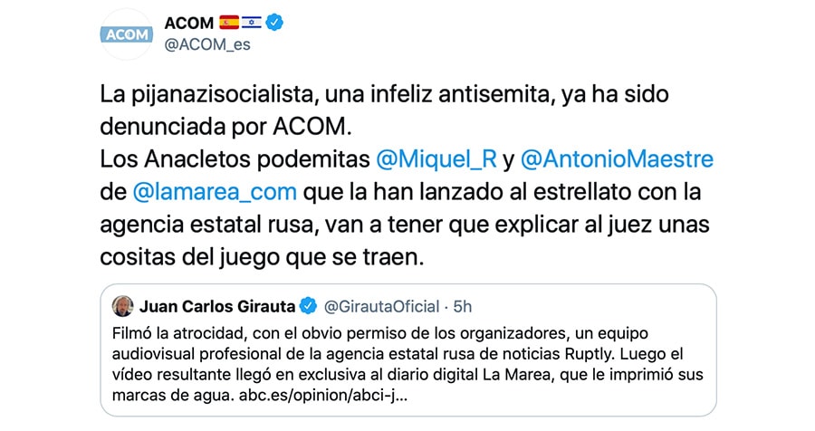 En su cuenta de Twitter acusan a este medio de participar en "tramas oscuras" e insultan a dos de nuestros colaboradores, a los que amenazan con "tener que explicar al juez unas cositas del juego que se traen". Pero no vamos a aceptar que nadie coarte nuestra libertad de expresión e información. Y vamos a seguir denunciando el antisemitismo.