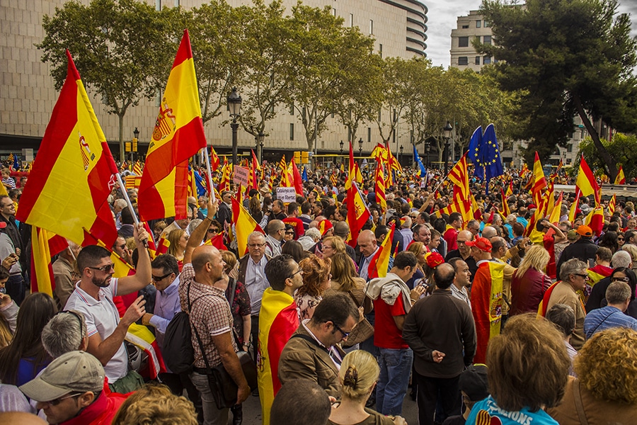 BARCELONA // Hasta seis movilizaciones distintas tienen lugar este sábado 12 de octubre en Barcelona. La más numerosa, la que ha congregado a miles de personas en la plaza de Catalunya bajo el lema “Som Catalunya. Somos España”, en la que se ha reivindicado la unidad de España, y que contaba con el apoyo del Partido Popular de Cataluña y Ciutadans. En la plaza de España, unos 300 neonazis han llevado a cabo una pretendida demostración de fuerza ante una nutrida presencia policial. Pocas horas antes, una concentración antifascista en la plaza de Sants protestaba por la presencia de la ultraderecha.